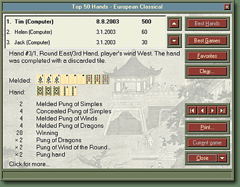 | Four Winds keeps Top 50 Hands and Top 50 Games tables for each rule preset. Here the Top